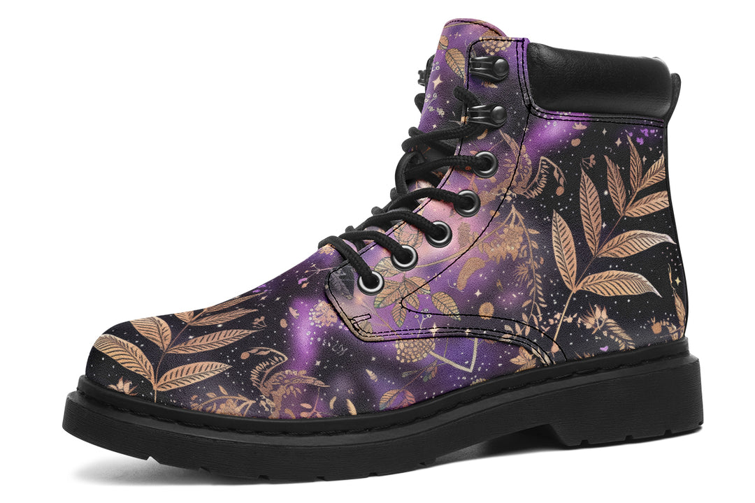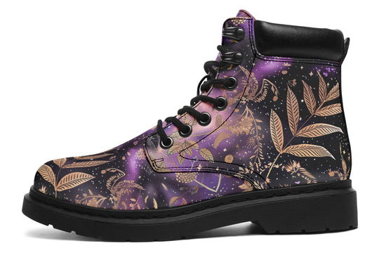 Dive into the cosmic wilderness with these mystical boots that blend rich purples, blacks, and captivating golden botanical designs. Featuring a starry sky motif, they bring the universe’s charm to your feet, perfect for daydreamers and night owls alike.