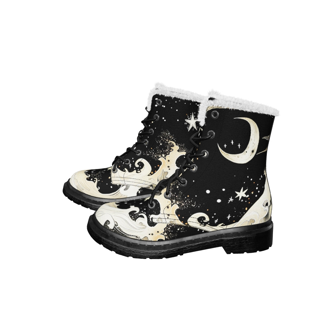 Step into the night with our robust winter boots, perfect for your witchy style. The Lunar Tide Winter Boots feature golden waves crashing beneath a crescent moon, casting a spell of celestial magic on your every step. Get ready to enchant the world around you!