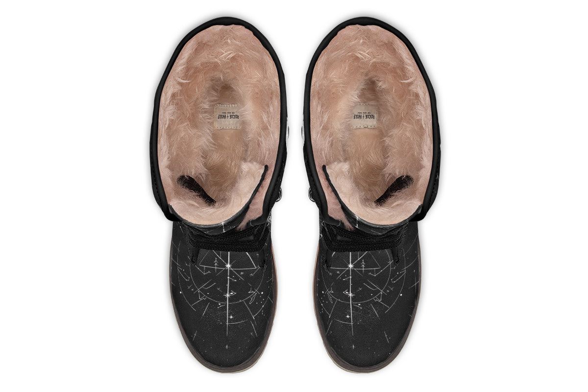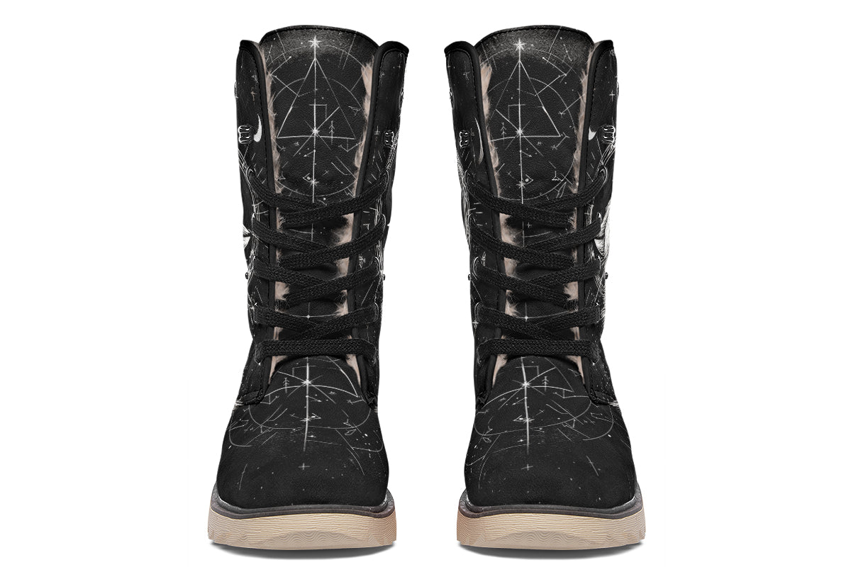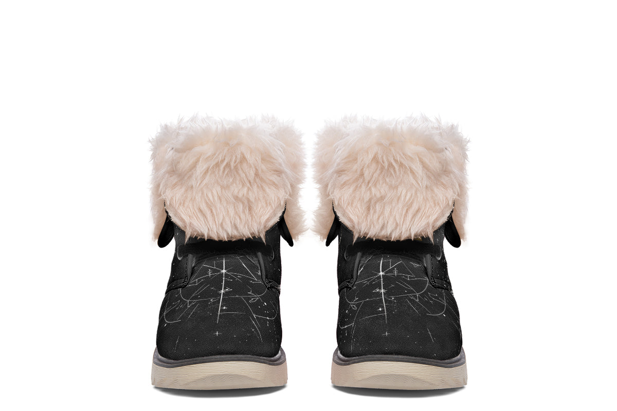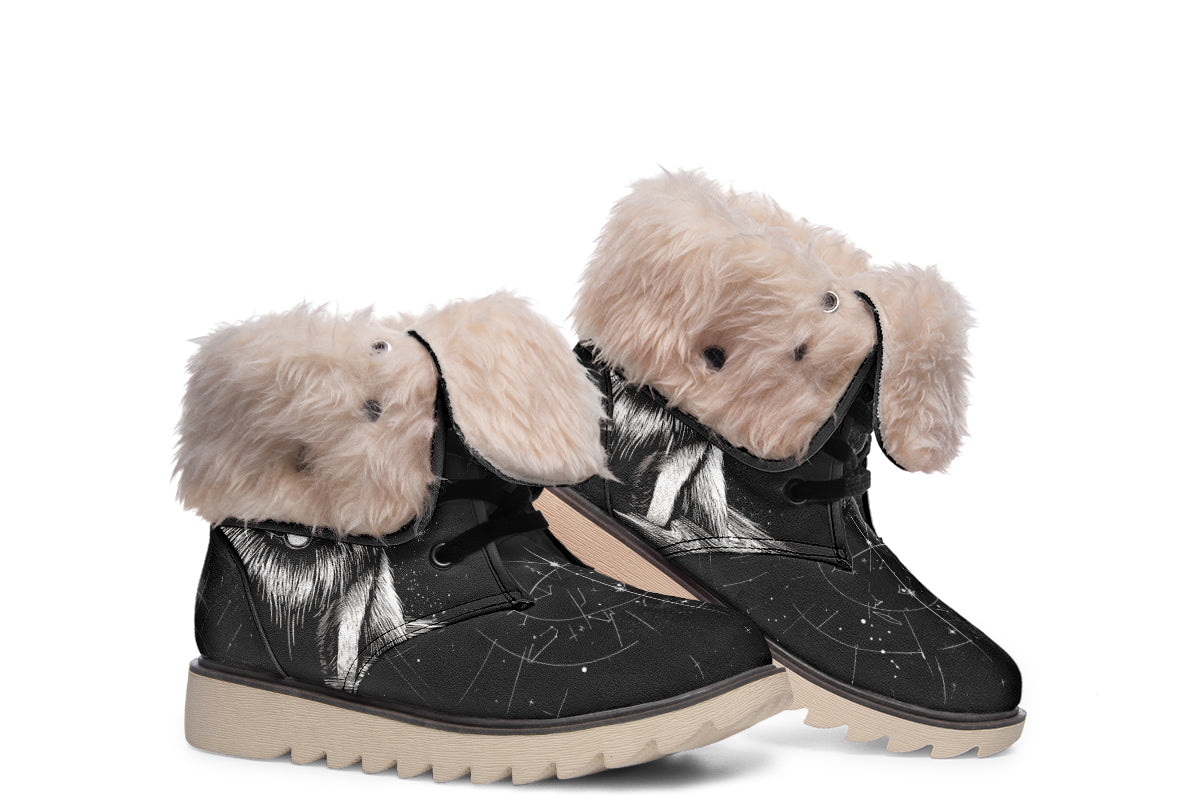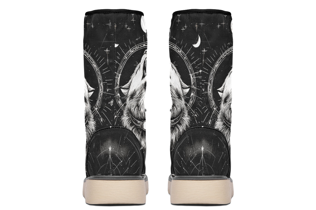 Unleash your inner lone wolf with Moonbound Wolf Fold Over Winter Boots—where moonlit mystery meets cosmic wanderlust.
