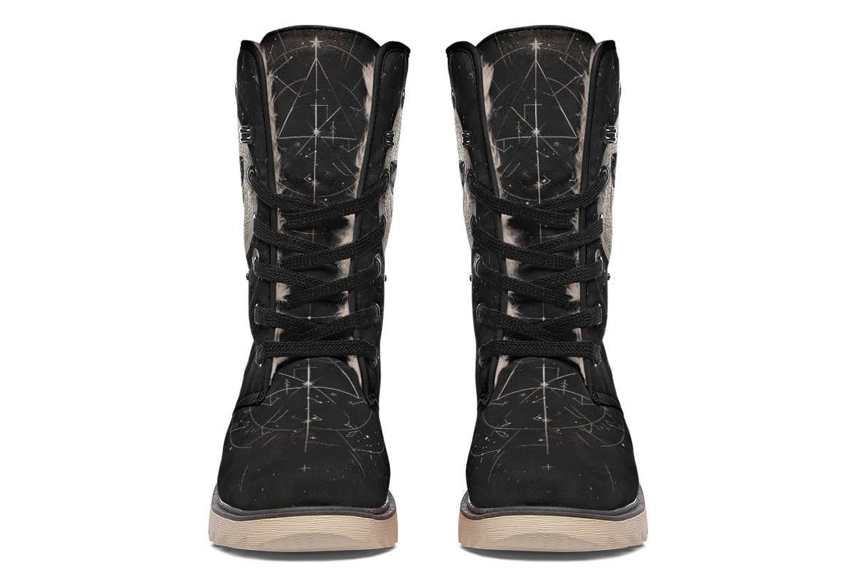 A lone wolf, wrapped in cosmic allure, prowls under a radiant full moon—this is the energy you channel in these boots. Constellations and celestial sigils whisper through the shadows, perfect for those who think midnight strolls are a personality trait. Get ready to outshine the full moon (just don’t blame us if wolves start howling at you).