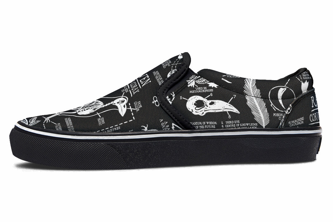 Unleash your inner mystic with our Raven Study Slipons, where the enigma of the night takes center stage. Featuring an intricate black-and-white tableau from an occult researcher’s notebook, these slipons celebrate the raven, Fate’s own winged emissary. Enter the gothic realm, where darkness meets style.