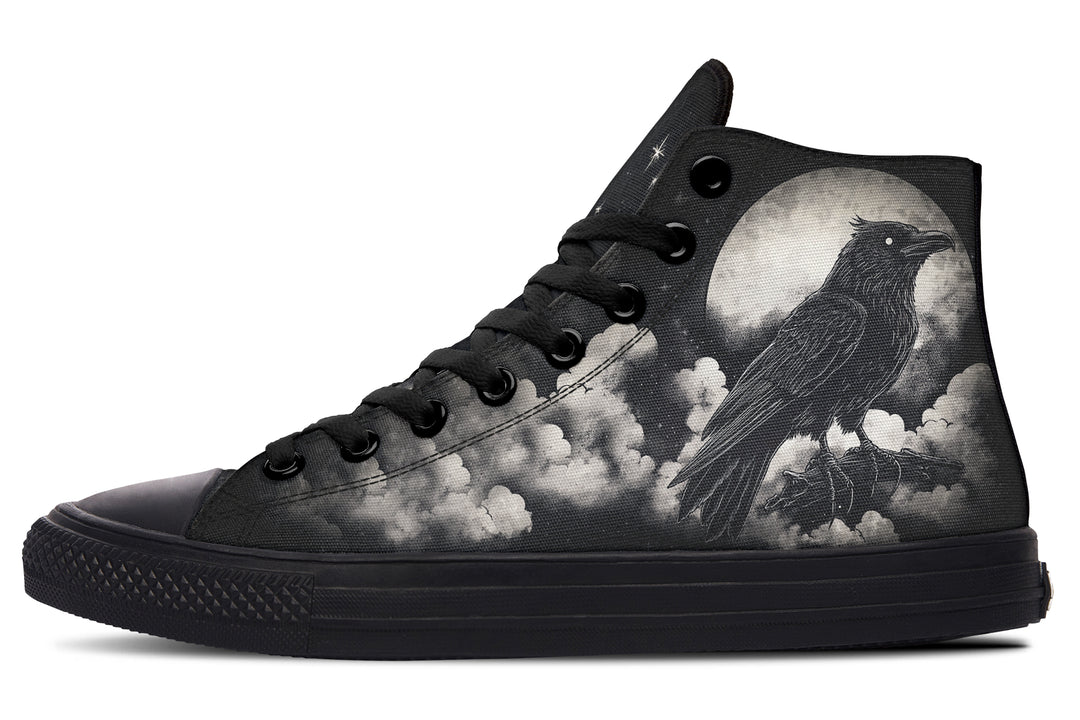 Step into a world where mystery meets style with our Doom Raven High Tops. Adorned with mesmerizing artwork of a solitary raven beneath a swirling moonlit sky, these shoes perfectly capture Rogue + Wolf’s gothic spirit. They’re not just high tops; they’re a spellbinding journey.
