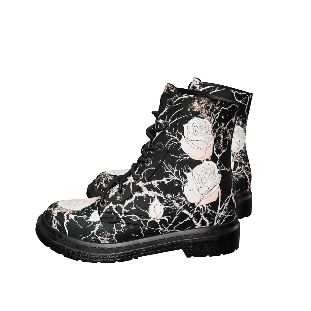 These enchanting boots artfully blend delicate blush pink roses with subtle cracks on a dark canvas, creating an otherworldly aura of warmth and sophistication. Wear them and feel the fusion of beauty and brokenness, as if conjured by a midnight spell.
