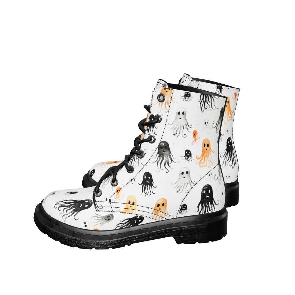 Step into the ethereal realm with our White Deep Haunting Boots, where ghostly octopuses dance across a white canvas in beguiling shades of black, orange, and grey. These playful apparitions bring a dash of whimsy and Halloween mischief to your gothic wardrobe.