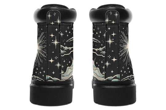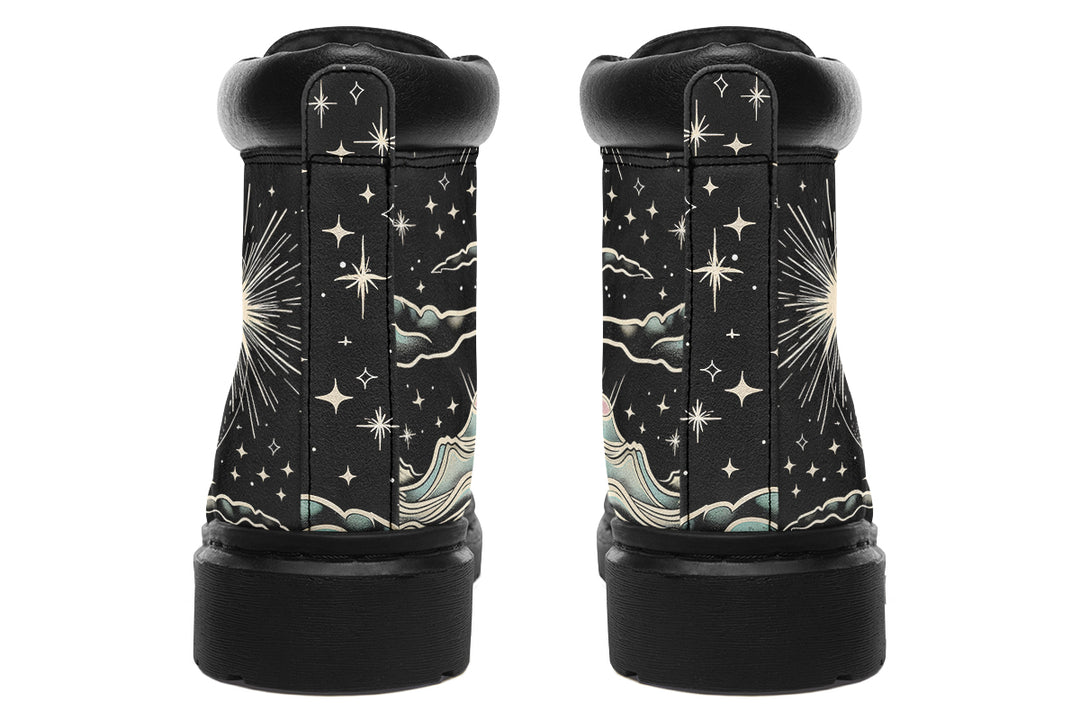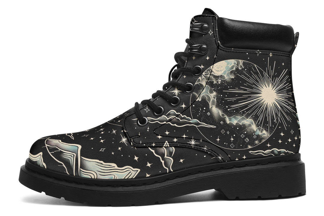 Step into a world where night’s enchantment meets cosmic wonders with our Dawn Star Classic Boots. Small clouds, majestic mountains, and a sky adorned with sparkling stars and a planet eclipsing the Star of Dawn make these boots a stellar addition to your alt wardrobe.