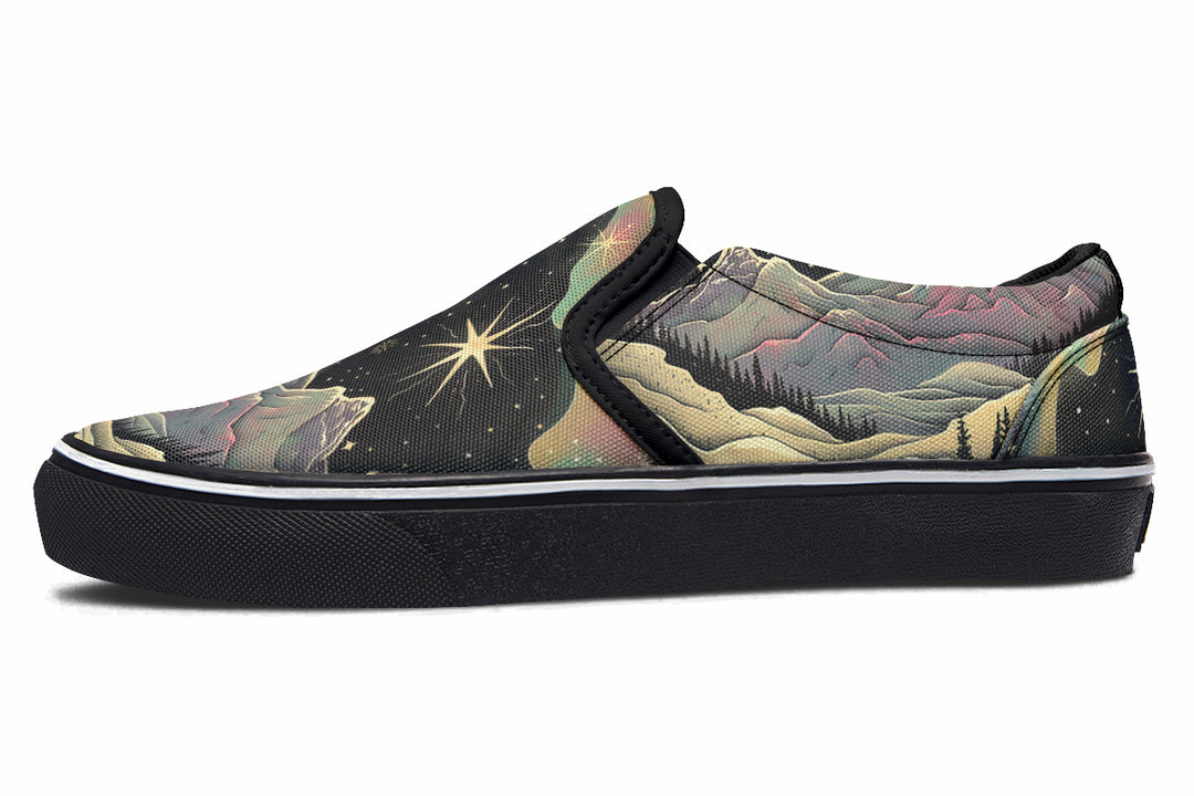 Bask in the ethereal glow of the Northern Lights, woven into the fabric of these spellbinding slipons. The moonlit sky beckons, with every step murmuring tales of the cosmic dance above. Step into an enigmatic world where the aurora weaves its magic, and be reminded that Twilight isn’t just for vampires anymore.