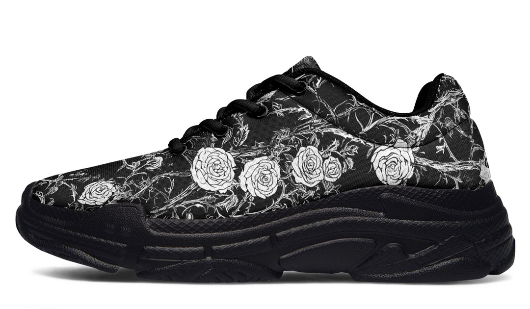 Step into a spellbinding world where fragility meets strength with our Fragile Rose Chunky Sneakers. Etched in monochrome artistry, white roses entwine with thorny vines on a shadowy backdrop, captivating your spirit and enshrining your every stride in mystique. Why stop at window-shopping when you can linger in this enchanting dance between opposites?