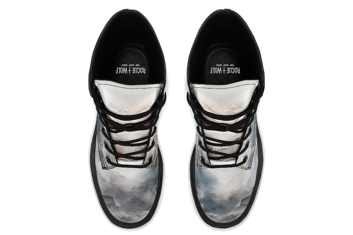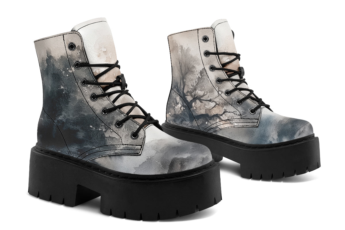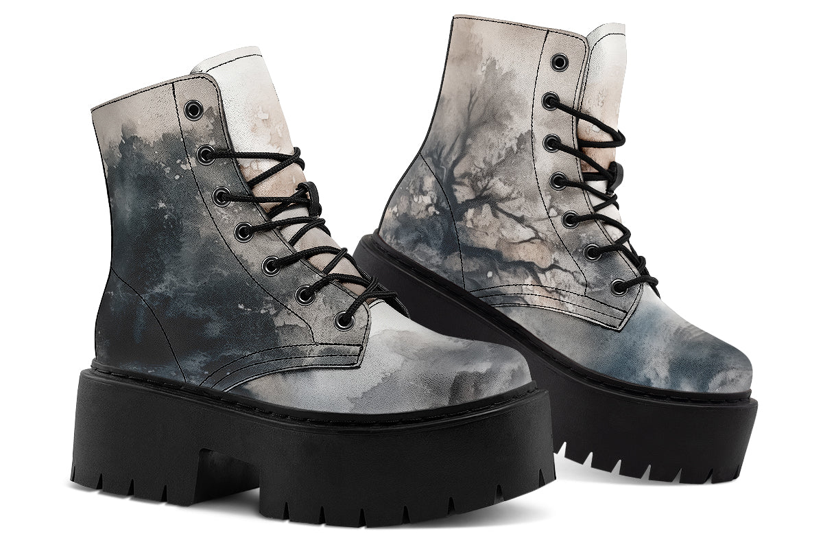 a world of twisted, barren trees brought to (after)life on a haunting ashen canvas, these platform boots summon the spirit of a forgotten forest veiled in perpetual twilight. If you ever lose your way, just blame it on the mist—classic witch move.