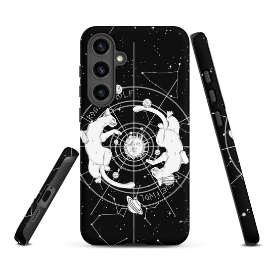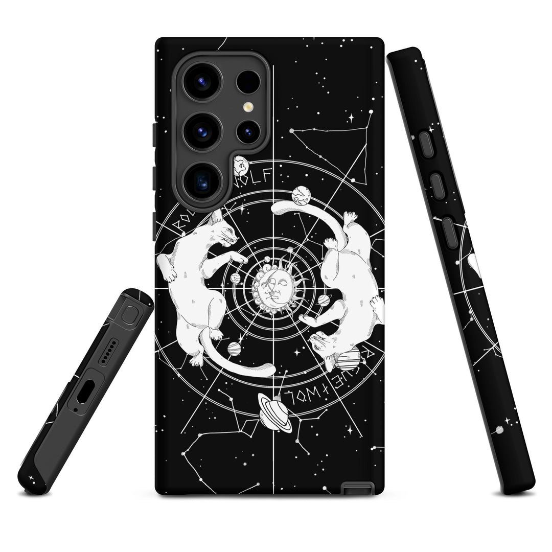 Immerse your phone in the mystical embrace of the Purr Nebula Tough Phone Case. Like a celestial charm, our case swirls with monochromatic marvels, two mystical cats arching in a divine dance around a central sun and moon motif, flanked by zodiac constellations and scattered stars. It’s a shockproof phone case and a cosmic talisman that sprinkles some witchy wow and goth glam onto your galaxy! Perfect for those who crave the dark academia and grunge aesthetic in their everyday. #JoinTheCoven