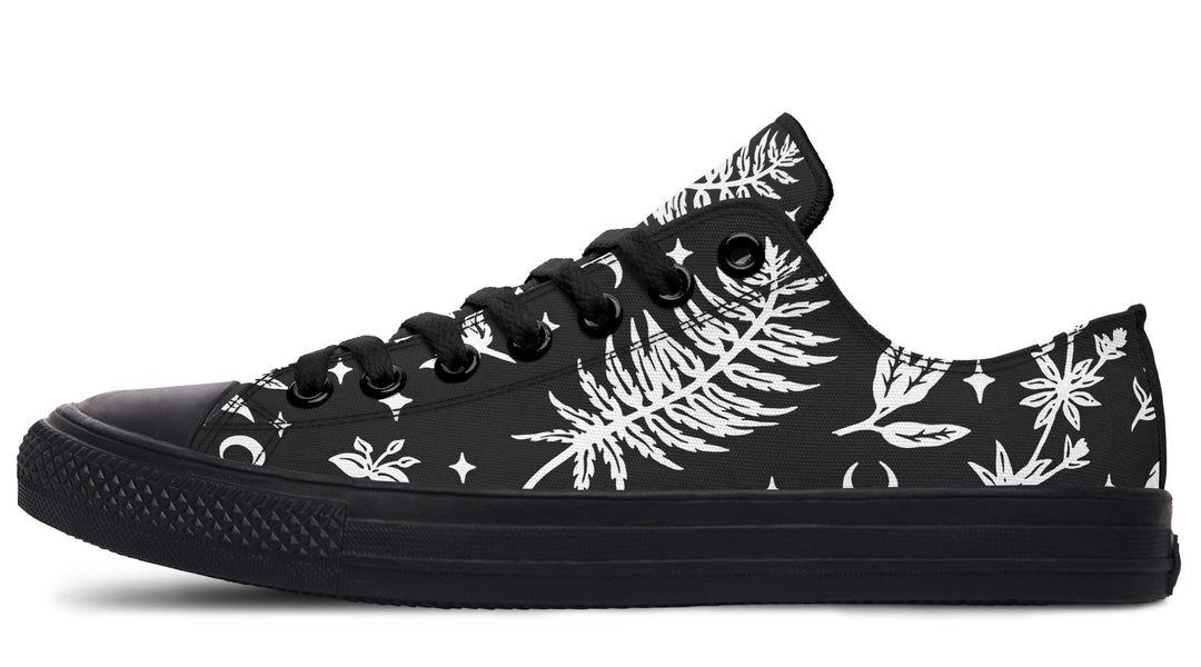 Embrace your inner enchantress with these bewitching Green Witch Low Tops. Ferns, flowers, berries, and herbs dance among the stars on a backdrop of black and white, capturing the essence of a witchy night sky. Perfect for those who live their life under the lunar glow.