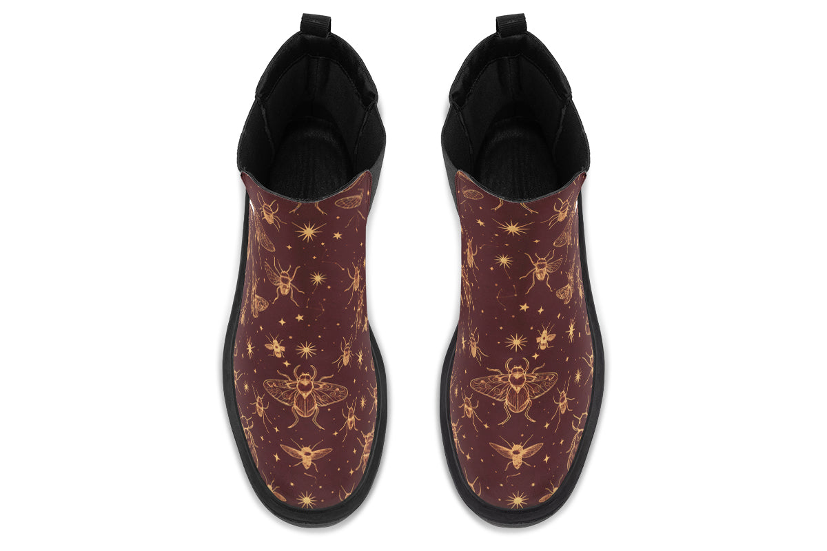 Channel your inner nocturnal researcher with a print that looks like a midnight star chart found in a dusty library. These boots pair an oxblood firmament with golden insects to keep your feet grounded while your head is in the constellations.